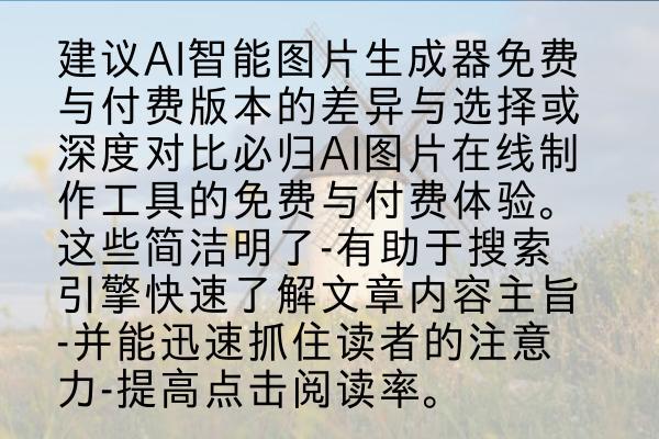 随着人工智能技术的不断发展,AI智能图片生成器成为了创意与技术的完美结合。对于需要频繁制作图片的用户来说,无论是出于个人爱好还是工作需求,在线的AI智能图片生成工具成为了一个不可或缺的选择。本文将重点对比必归AI图片在线制作的免费与付费版本,帮助用户了解两者之间的差异,以便做出明智的选择。